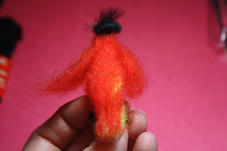 The feathers I had on hand were very fluffy. The ends of the feathers didn't really stick in the felt. Glue and patience helps. A little bit of yellow feather was used as well. The beak is felted and I don't like the look of it.
